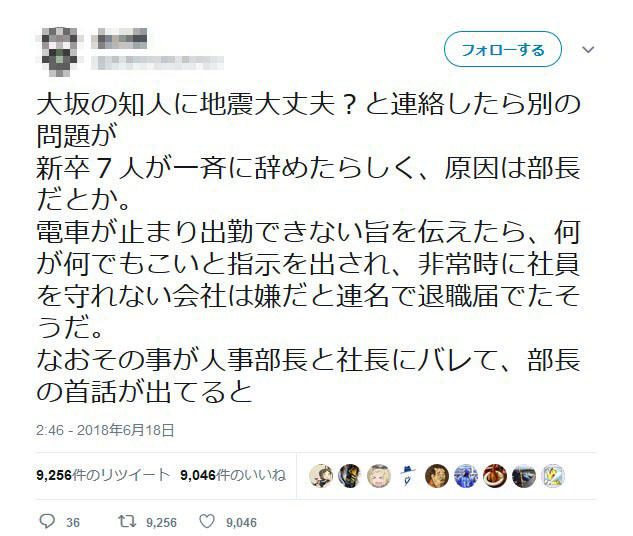 嘘松「地震で電車が止まってるのに部長に何が何でも来いと言われたので新卒7人で連名で退職届出した。」